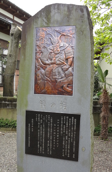と戦陣を馳せる景季公の風雅を平家物語など諸本が伝え、今日でも能や歌舞伎で「箙(えびら)の梅」が演じられている。八月、一之宮八幡大神例祭の宵宮の屋台巡行に加わる「西町」の屋台は館址にふさわしく、梶原氏に因む彫刻で飾られ、碑の景季公は一部を模写したものである。