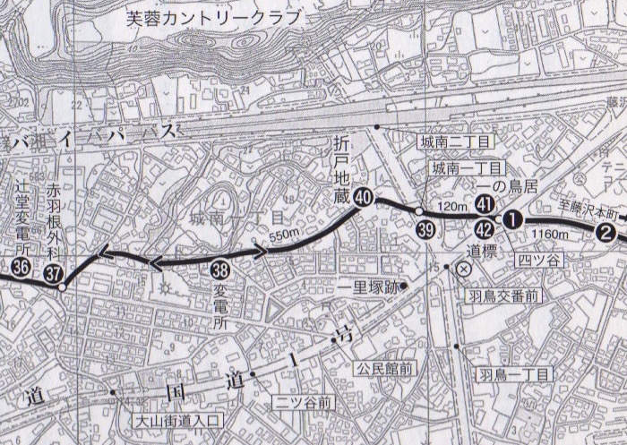 地図の(41)(42)(1)で囲まれた四ツ谷交差点です。目の前の道路は国道1号線で旧東海道です。