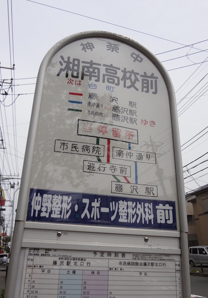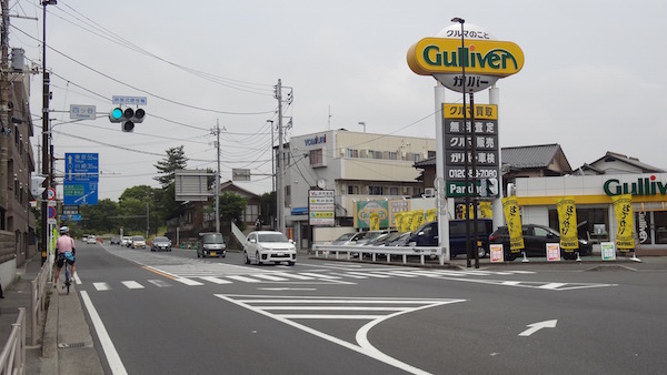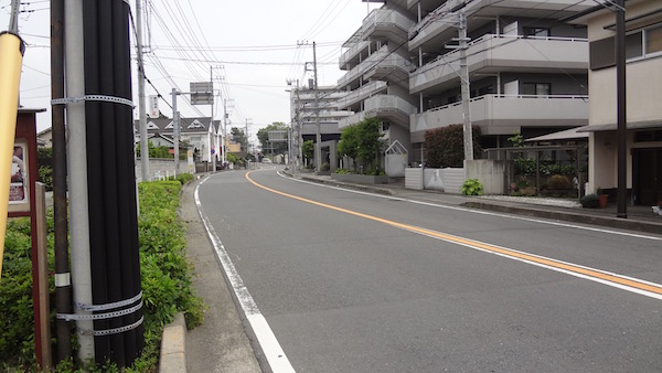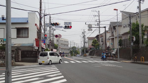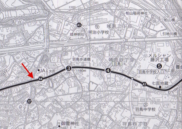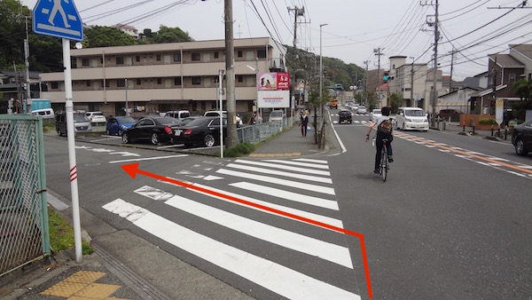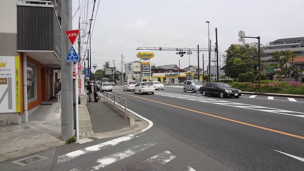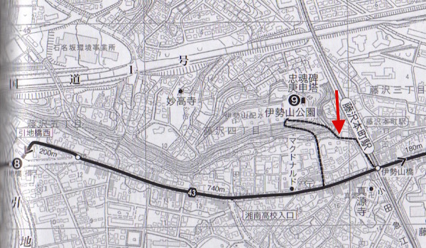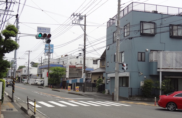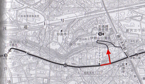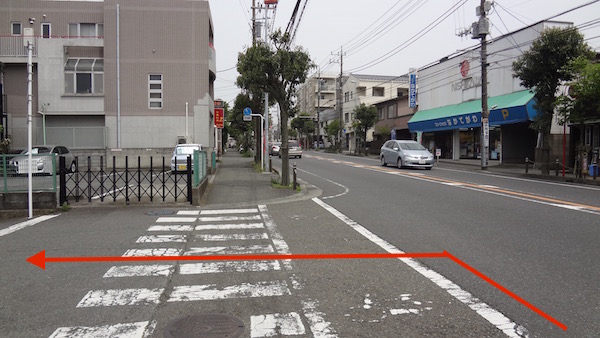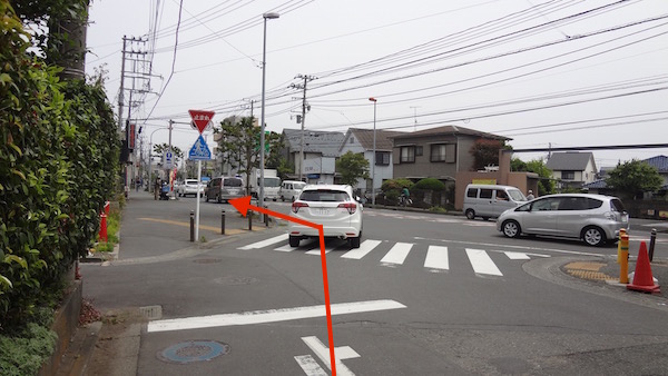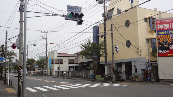 湘南高校入口交差点から東へ進み、マクドナルドと郵便局を過ぎた路地を左折します。地図では赤で示しました。