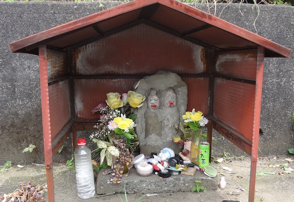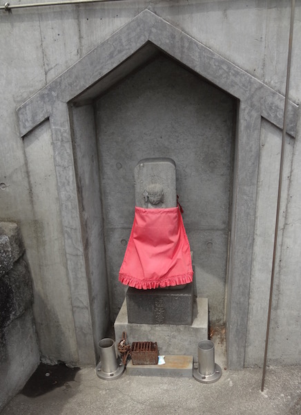 メルシャン藤沢工場をあとにして坂を下っていくと、進行方向右側にこんなお地蔵さんがありました。白粉と口紅をしているように見えます。