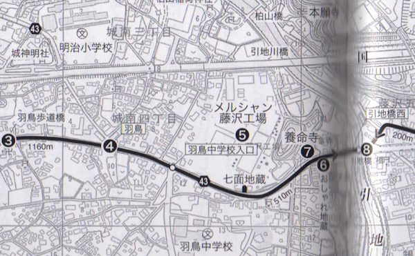 地図(8)のやや左側の引地橋西交差点です。引地橋の下には引地川が流れています。