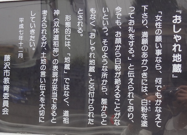 「『女性の願い事なら、何でもかなえて下さり、満願のあかつきには、白粉を塗ってお礼をする。』と伝えられており、今でも、お顔から白粉が絶えることがないという。そのような所から、誰からともなく『おしゃれ地蔵』と名付けられたとされる。形態的には『地蔵』ではなく、道祖神(双体道祖神)の表現が妥当であると考えられるが、土地の言い伝えを大切にしていきたい。
