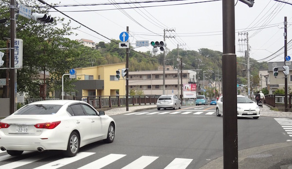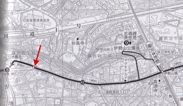 引地橋を渡ると左折します。地図の(8)の場所です。