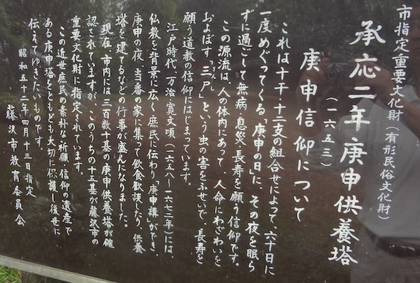 これは十干・十二支の組合せによって、六十日に一度めぐってくる「庚申の日」に、その夜を眠らずに過ごして無病・息災・長寿を願う信仰です。この源流は、人の体内にあって、人命にわざわいをおよぼす「三尸」という虫の害をふせいで、長寿を願う道教の信仰にはじまっています。江戸時代、万治・寛文頃(一六五八〜一六七二年)には、仏教を背景に広く庶民に伝わり「庚申講」ができ、庚申の夜、当番の家に集まって飲食歓談したり、供養塔を建てるなどの行事が盛んになりました。現在、市内には三百数十基の庚申供養塔が確認されていますが、このうちの十五基が藤沢市の重要文化財に指定されています。この近世庶民の素朴な祈願・信仰の遺産である庚申塔をともども大切に保護し後世に伝えてゆきたいものです。