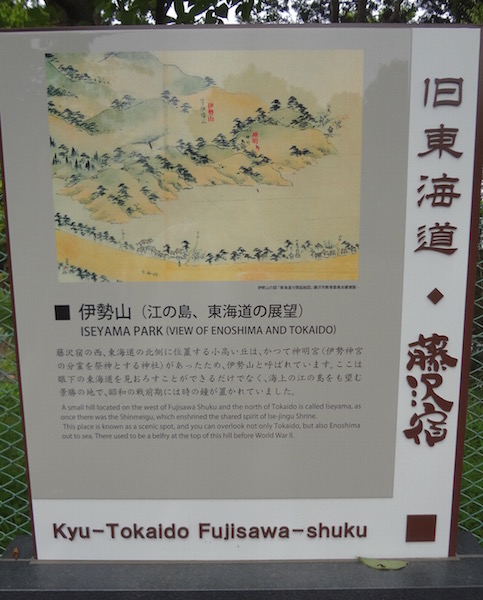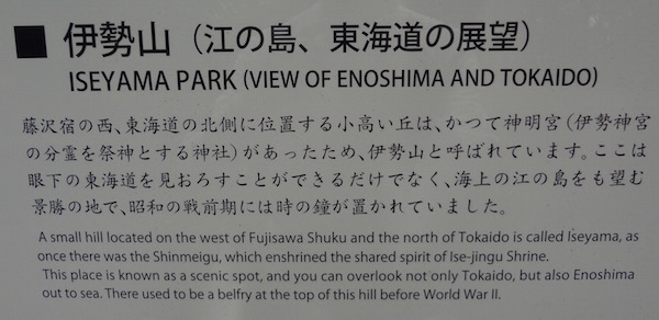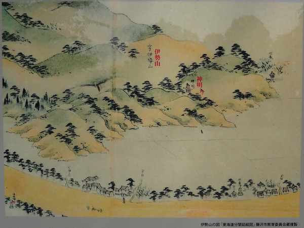 「藤沢宿の西、東海道の北側に位置する小高い丘は、かつて神明宮(伊勢神宮の分霊を祭神とする神社)があったため、伊勢山と呼ばれています。ここは眼下に東海道を見下ろすことができるだけでなく、海上の江の島をも望む景勝の地で、昭和の戦前期には時の鐘が置かれていました。