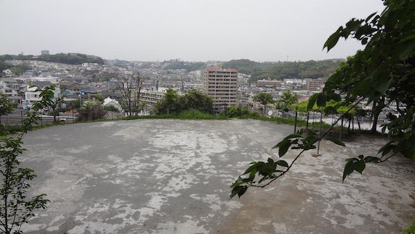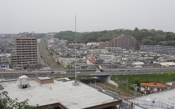 江の島の反対側の北を望みます。グラウンドの向こうに丘陵地帯が広がっており、住宅やマンションになっています。