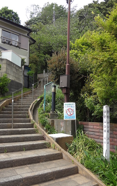 伊勢山公園へは南側から登りましたが、帰りは東側(赤矢印)へ降りてきました。