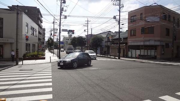 地図の赤矢印の白旗交差点です。ここを左折します。