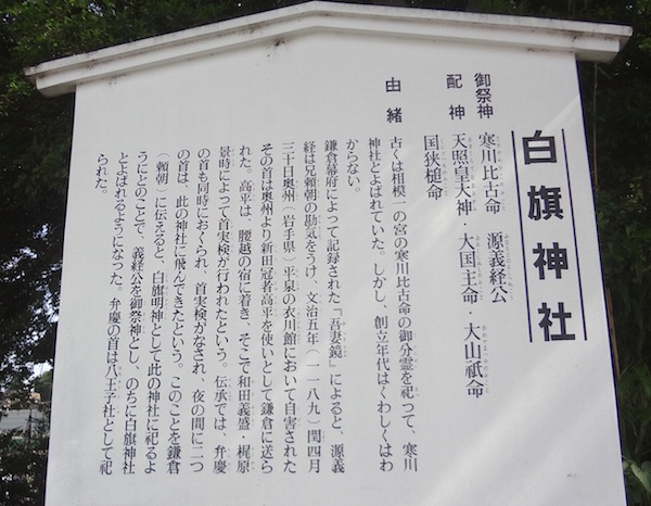 由緒 古くは相模一の宮の寒川比古命の御分霊を祀って、寒川神社とよばれていた。しかし、創立年代はくわしくはわからない。鎌倉幕府によって記録された『吾妻鏡』によると、源義経は兄頼朝の勘気をうけ、文治五年(一一八九)閏四月三十日奥州(岩手県)平泉の衣川館において自害された。その首は奥州より新田冠者高平を使いとして鎌倉に送られた。高平は、腰越の宿に着き、そこで和田義盛・梶原景時によって首実検が行われたという。伝承では、弁慶の首も同時におくられ、首実検がなされ、夜の間に二つの首は、此の神社に飛んできたという。このことを鎌倉(頼朝)に伝えると、白旗明神として此の神社に祀るようにとのことで、義経公を御祭神とし、のちに白旗神社とよばれるようになった。弁慶の首は八王子社として祀られた。」