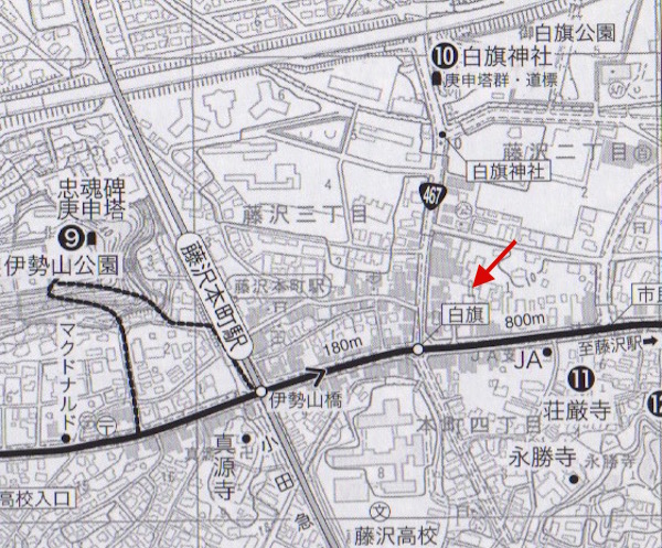 遊行寺からの帰りは地図の赤線のように進みました。この辺りにあるはずの藤沢宿の江戸見附跡を探したのですが、見付けられませんでした(笑)