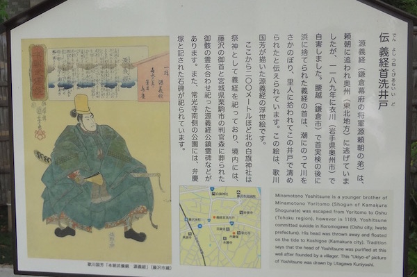 源義経(鎌倉幕府の将軍源頼朝の弟)は、頼朝に追われ奥州(東北地方)に逃げていましたが、一一八九年に衣川(岩手県奥州市)で自害しました。腰越(鎌倉市)で首実検の後に浜に捨てられた義経の首は、潮にのって川をさかのぼり、里人に拾われてこの井戸で清められたと伝えられています。この絵は歌川国芳が描いた源義経の浮世絵です。ここから二〇〇メートルほど北の白旗神社は祭神として義経を祀っており、境内には、藤沢の御首と宮城県栗駒市の判官森に葬られた御骸の霊を合わせ祀った源義経公鎮霊碑などがあります。また、常光寺南側の公園には、弁慶塚と記された石碑が祀られています。」