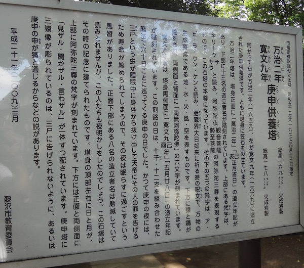 「庚申信仰は、十干・十二支の組合せによって、六十日に一度めぐる庚申の日に、徹夜で無病・息災・長寿を願う信仰である。「人の体内にいる三尸の虫が、庚申の夜、天に登ってその人の罪過を天帝に告げるため生命を縮められる」とする道教の教えに由来している。この供養塔の中央上の梵字は釈迦如来(主尊)、続く八字はナモアミダブソワーカーの一呪、下の梵字はここでは青面金剛を表している。猿像の脚ぼその彫刻は、江戸時代初期のものに見かけられるものである。