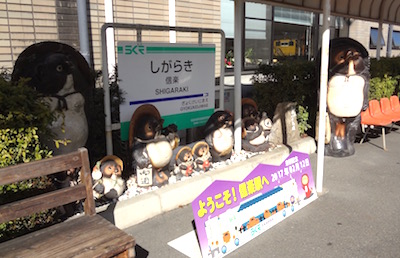 改札を出たところにはテツコ駅長というたぬきが! 最近ではいろいろな駅に動物の駅長がいますが、ここは信楽焼の動かない駅長がいます。
