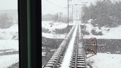 この列車に乗り込みます。青空を見せていたお天気でしたが、再び悪化し雪が降り続くようになりました。気温もぐんぐんと下がっています。