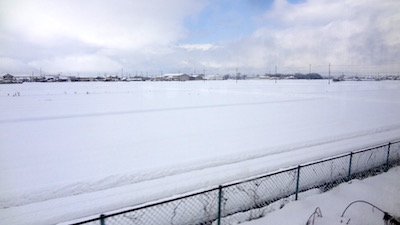 帰りの関ヶ原付近の様子です。厚い雪が地面を覆っています。大垣を過ぎる頃には積雪はなくなりました。たいした遅れもなく小田原に到着し、小田急線で伊勢原へ帰ってきました。