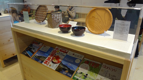 ラウンジの中の様子です。小田原産の木材を使用しており、木のぬくもりを感じられるような休憩スペースです。利用可能時間は運行日の10時30分から11時30分(出発10分前)です。窓の外には小田原城も見えます。