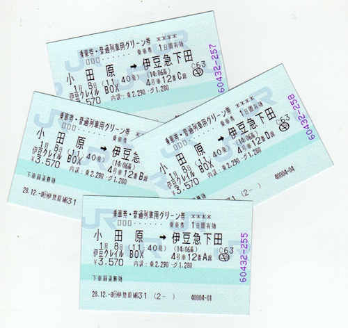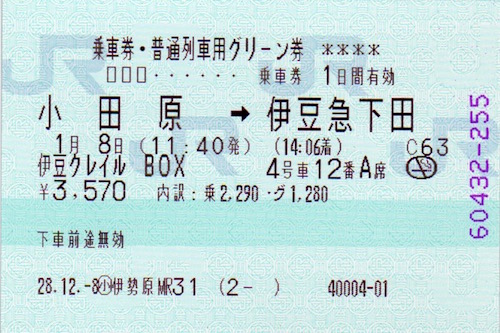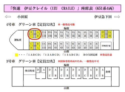 伊豆クレイルの切符です。4号車の12番のA〜Dまでのボックス席を取ることができました。