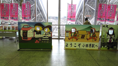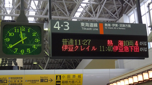 この日は他の列車の遅延の影響を受けて伊豆クレイルも10分ほど出発が遅れました。小田原駅構内には伊豆クレイルの穴あきパネルもありました。