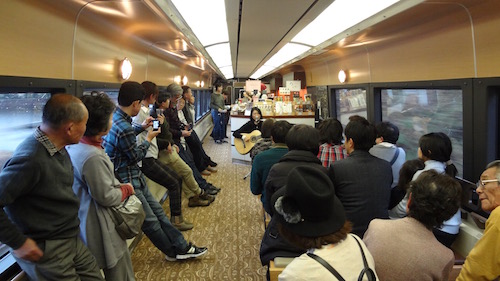 2号車の売店脇のスペースでミニライブが始まりました。地元の方のボサノバの演奏です。