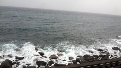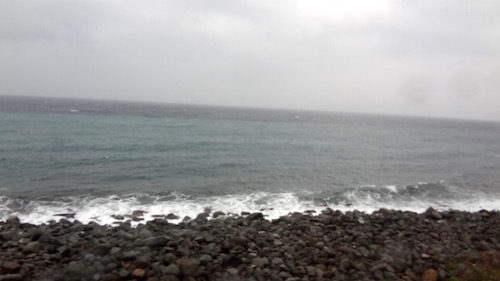 波打ち際をゆっくり走っています。天気がよければもっと明るくて美しい風景が広がることでしょう。