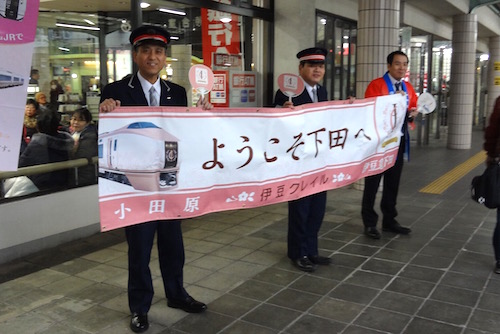 終点の伊豆急下田駅に到着しました。専用アテンダントが見送ってくれます。