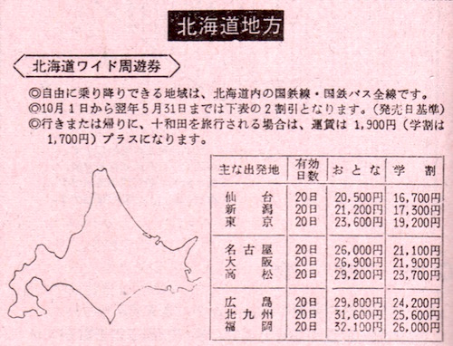 新宿で国鉄の「北海道ワイド周遊券」を購入する。20日間で、さらに学割で19,200円という格安切符だ。おまけに今日からは2割引なので15,360円とさらにお得になった。せっかくだから北海道の国鉄路線を全線制覇してみようと思う。さらに、楽しみの一つは車窓なので、夜間に通った場合はカウントせず、実際に車窓を眺めることでの全線制覇してみたい。