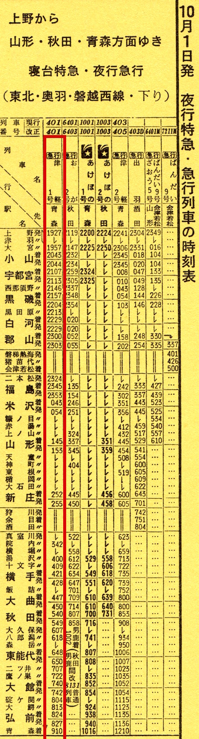 上野1937-翌0910青森 急行津軽1 東北本線/奥羽本線 401