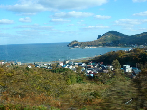 変わった名前の銭函を過ぎると右手には石狩湾が見えてくる。このあたりは山が海に迫っているので海岸線なりのルートしかなく、そのため車窓はすこぶる良い。石狩湾の向こう側には暑寒別岳の山々が見えている。