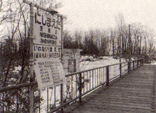 次の西前田は板張りだけの無人駅。線路は左にカーブし、右手からは国道229号線が近づいてくる。列車は下り勾配を日本海に突っ込むようにして岩内駅に入る。