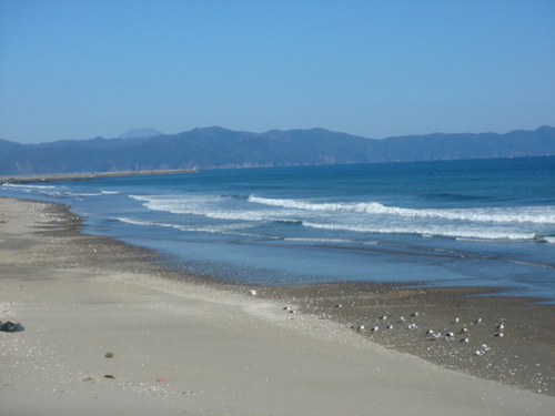 徒歩5分で海岸へ出ると雄大な景色が待っている。中央左には羊蹄山が見えている。
