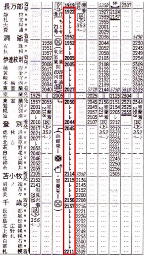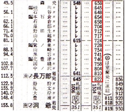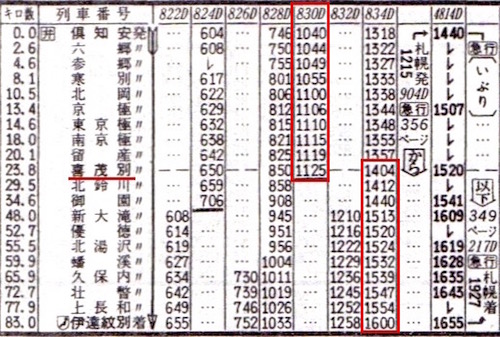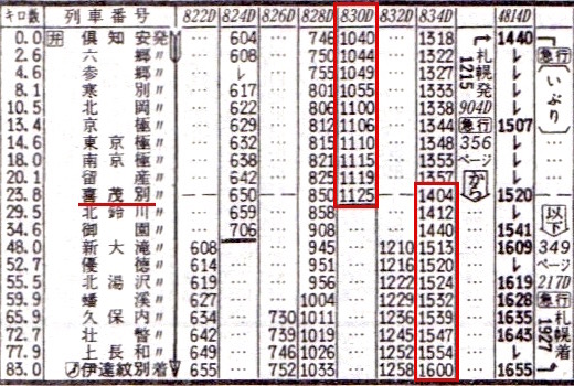時刻表の右端にある「急行いぶり」。これは札幌発札幌着の珍しい"循環"急行だ。札幌→小樽→倶知安→京極→喜茂別→伊達紋別→東室蘭→苫小牧→札幌(逆順もあり)というルートで、京極駅ですれ違う。この急行に乗りたかったが時間が合わなかった。