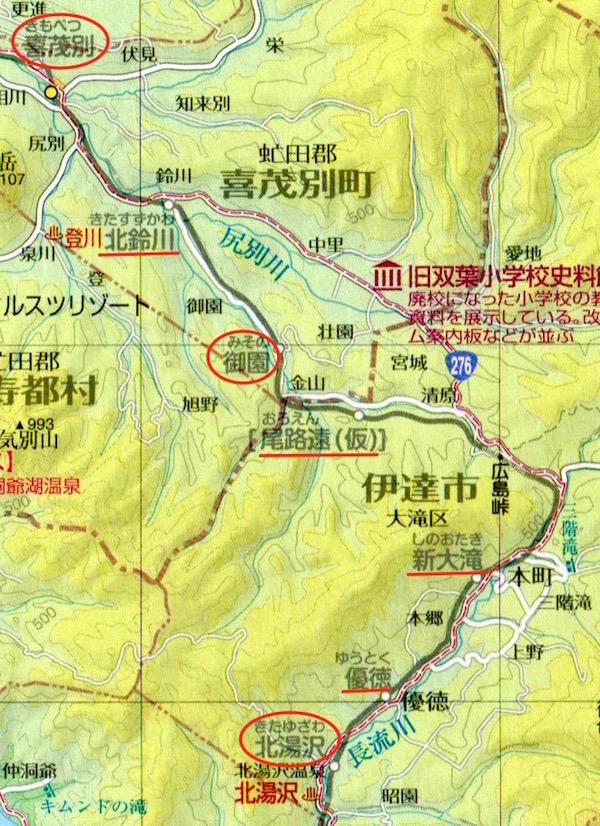 喜茂別からは喜茂別川を渡り国道230号線と交差し、さらに尻別川を二度渡り北鈴川、御園に到着する。