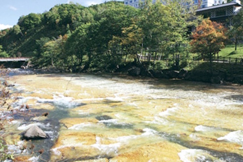 優徳を過ぎ北湯沢に近づくと長流川沿いには川床一面に大理石を敷いたように美しい「白絹の床」がある。