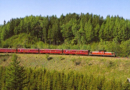 札弦(さっつる)、緑という集落を拾いながら南下している。緑では普通列車と列車交換。緑をでてからは札弦川の支流のオニセップ沢川の谷を25パーミルの急勾配を上っていく。屈斜路湖の外輪山を釧北トンネル(549m)で抜けてカルデラに入る。釧路川水系となり25パーミルの勾配を今度は下って川湯につく。緑から川湯までは14.5kmもあるがほとんどが森の中で眺望は期待できない。