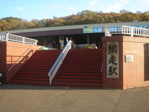 網走駅に到着した。駅近くには紅葉した樹木も見られる。