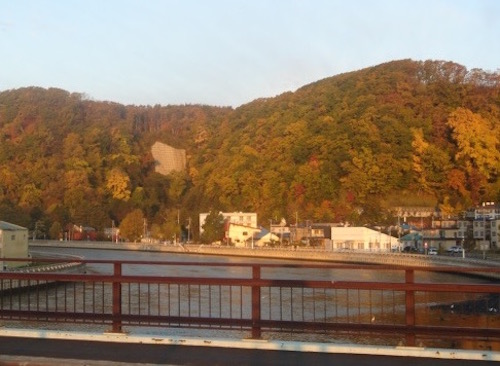 網走駅からすぐそばの網走川の橋から西の山を眺めると、こちらも紅葉が始まっている。