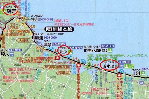 北浜駅はホームの外側が砂浜で「オホーツク海に一番近い駅」として知られている。左手にはオホーツク海がずっと寄り添ってくる。