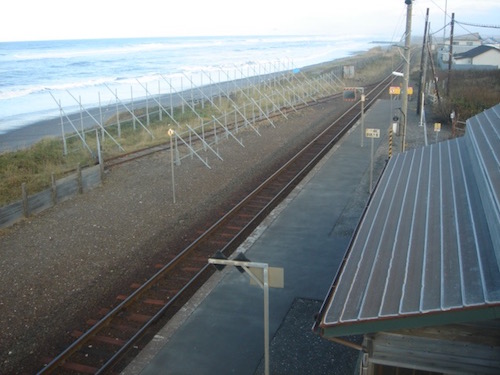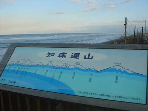止別(やんべつ)を過ぎ、知床連山を正面見て、砂丘の上をオホーツク海に沿って走りながら列車は斜里駅に入る。