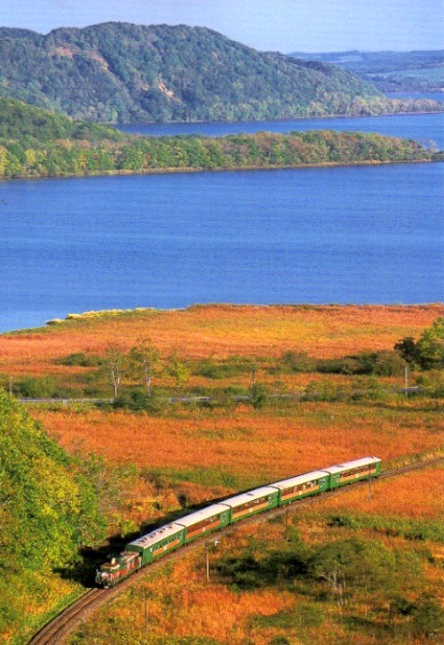 藻琴(もこと)駅を過ぎると右手の陸側に藻琴湖が見え、優美な姿の藻琴山(1,000m)が見える。屈斜路湖カルデラの外輪山であり、向こう側は屈斜路湖だ。