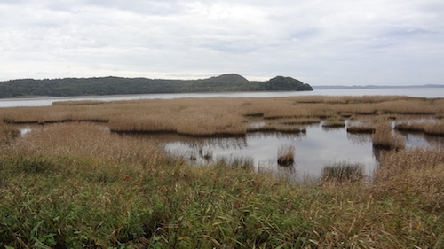 門静を出ると、すぐに右手に海が飛び込んでくる。海沿いを真っ直ぐに進む。右手前方には厚岸湾を囲む厚岸半島が見えて来る。海沿いを離れるとしばらくして厚岸に到着する。