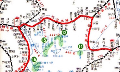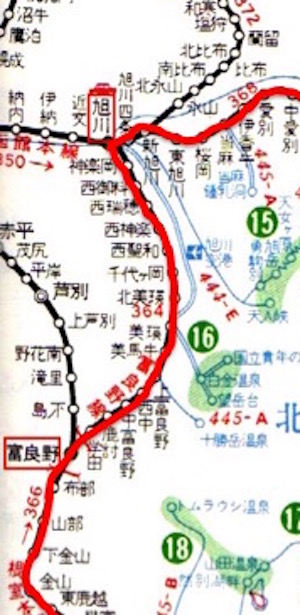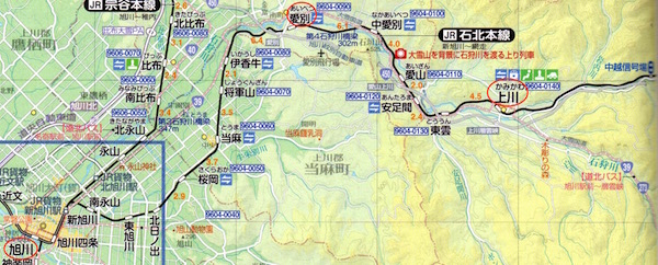 天幕(てんまく)を過ぎ、谷が開けてくると上川に着く。留辺蘂で別れた国道39号線は石北峠や層雲峡を通ってここで合流する。上川からは石狩川に沿って谷を下る。