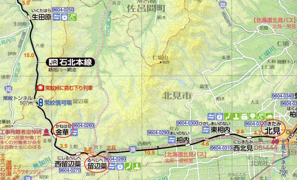 谷が狭くなってくると製材と酪農の留辺蘂(るべしべ)へ着く。国道39号とはここで別れ、ここからは国道242号線と並走する。登り勾配がきつくなるなか金華(かねはな)へ。ここで網走行きの普通列車と列車交換。こちらは急行なので金華は通過する。