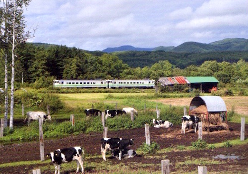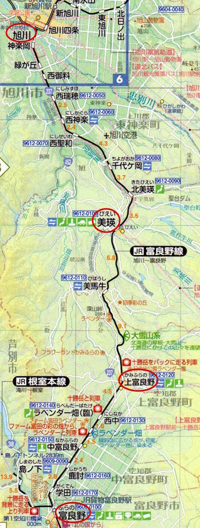 登りきったところで美瑛に着く。美瑛を出てすぐに、西聖和で別れた美瑛川を渡り、今度はその支流の憩川の谷を遡る。遡る途中で南西に進み、小丘陵を越えて美瑛美馬牛川の谷へ、次いでまた小丘陵を越えて美馬牛大成川の小支流の谷へ出て、そしてまたまた小丘陵を越えて美馬牛大成川の本流を渡って美馬牛(びばうし)駅に着く。谷と丘陵を何度も乗り越えている。美馬牛で旭川行き普通列車と列車交換する。