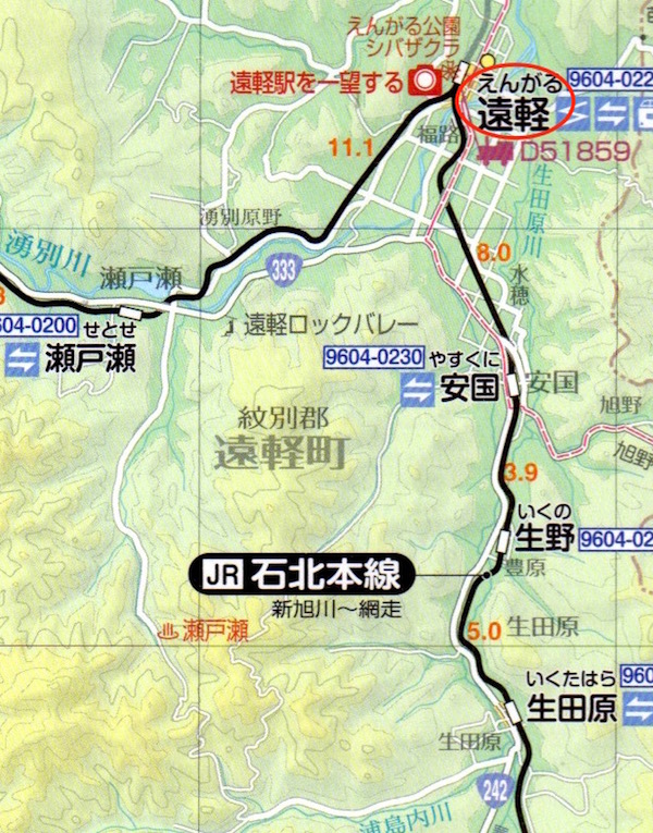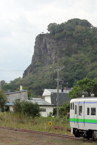 そして湧別川を渡り、左手に大きわ岩山の瞰望岩(がんぼういわ)(81m)が見えて来ると名寄本線との接続駅の遠軽に着く。
