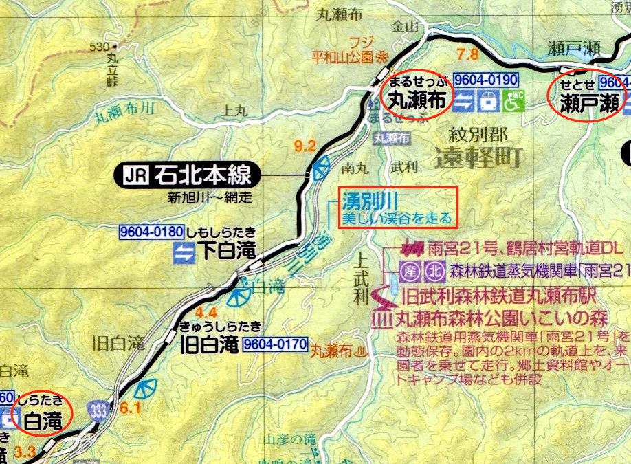 谷はさらに幅を狭くして湧別川を遡る。この先、下白滝、旧白滝仮乗降場、白滝、上白滝、奥白滝と18.8kmの中に「白滝」とつく駅が五つも並んでいる。