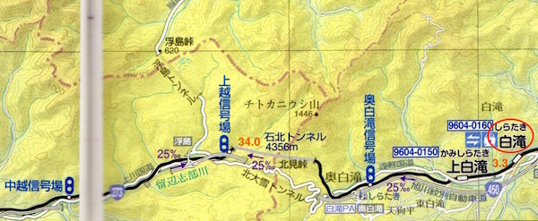 白滝駅の周囲のみ集落がみられる。上白滝から25パーミルの急勾配を登っていき、奥白滝で釧路行きの急行大雪1号と列車交換。ともに急行なので奥白滝には停車しない。北見峠の石北トンネル(4,356m)をくぐり上川地方に入る。そして上越(かみこし)信号場を過ぎ、石狩川の支流の留辺志部川の狭い谷を延々と下っていく。