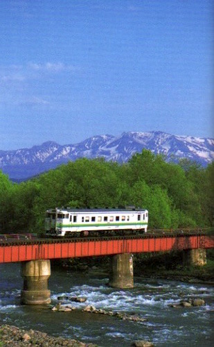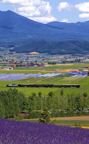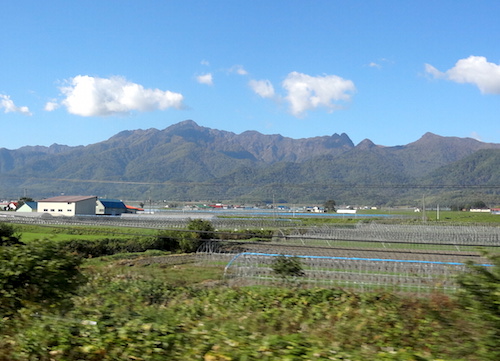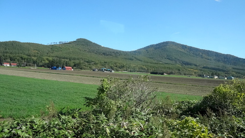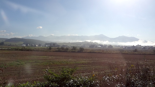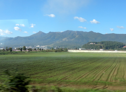 富良野駅は盆地の南端にある。富良野で2時間以上ゆっくりと休み、これから出発する。富良野を出ると空知川を右手に見ながら南下する。左には十勝岳(2,077m)が見える。