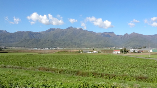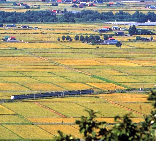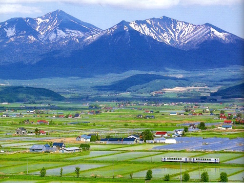 線路は谷の西側に走っていくので十勝岳連峰の眺めは抜群だ。山の眺めの手前に盆地いっぱいに水田が広がっている。