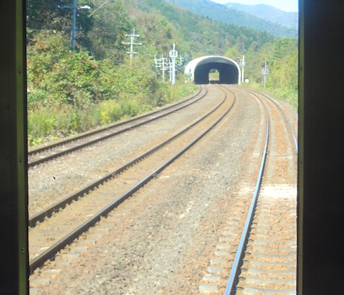 いよいよ狩勝越えだ。12年前までは、ここから東に向かい標高644mの狩勝峠を狩勝トンネル(954m)で越え、うねうねと馬蹄形に旋回しながら新内(にいない)、新得へ下りていった。狩勝トンネルを越えたところからの車窓風景は絶景とされたが25パーミルの連続急勾配が運転上の悩みの種であった。現在では、落合から川沿いに鬱蒼とした森の中を第一〜第五までの落合トンネルをくぐり南下する。第五落合トンネルをくぐり川を渡り、新狩勝トンネル(5,810m)に入る。工事中の石勝線のトンネル入口は分かれていて、トンネル内で合流する。ここの標高は約460mで、まっすぐに東に向いている。