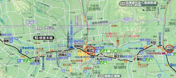そこから築堤の上へ出て、右に曲がると左から士幌線の線路が合流し帯広へ着く。帯広では2分停車。下車しない。